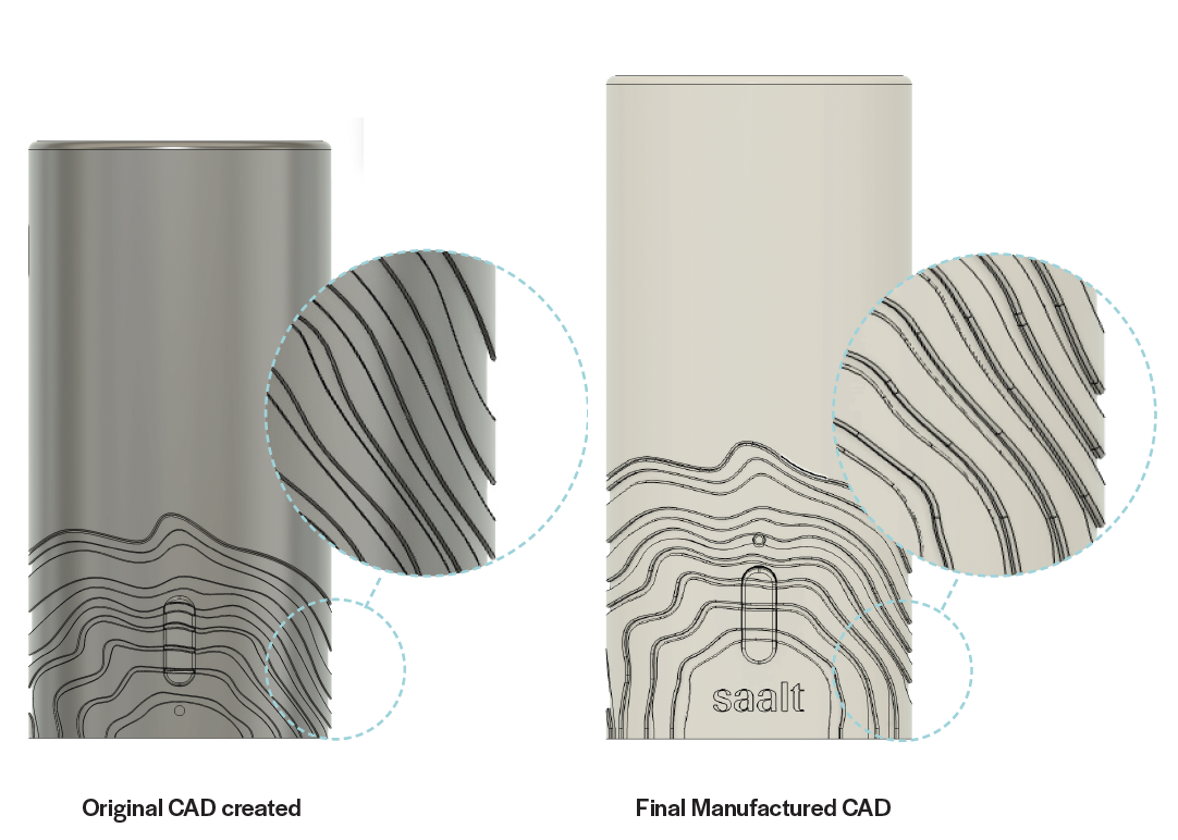 To meet Saalt Co.'s seamless design expectations, the original CAD was created in Fusion 360's solids tab, but undercuts along the motif made manufacturing difficult.